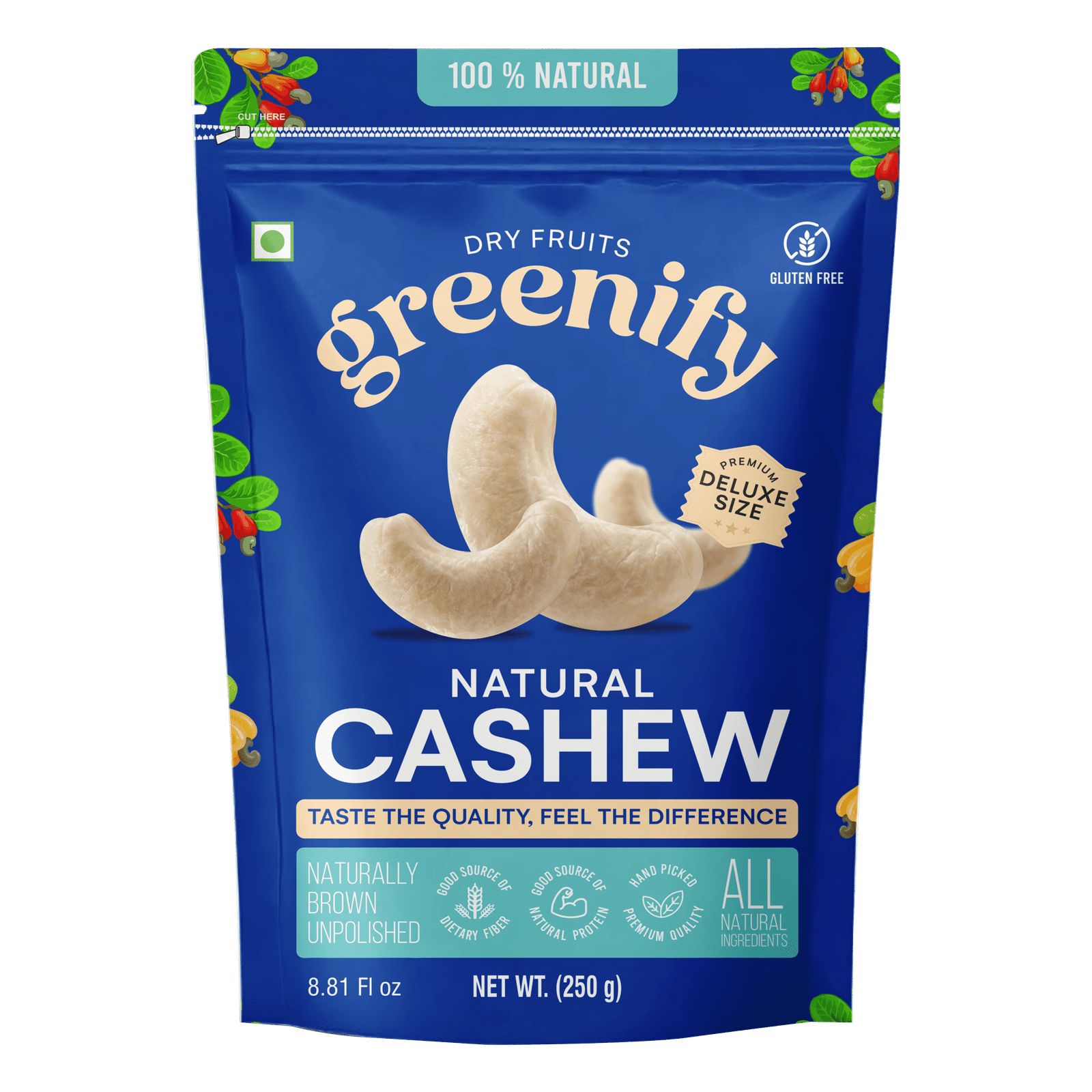 Zip-lock freshness: multi-layer pouch is heat-sealed to block moisture, then fitted with a slider zip so you can re-seal after each use. Keeps cashews flavour-stable for 6–9 months at room temperature.